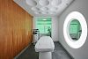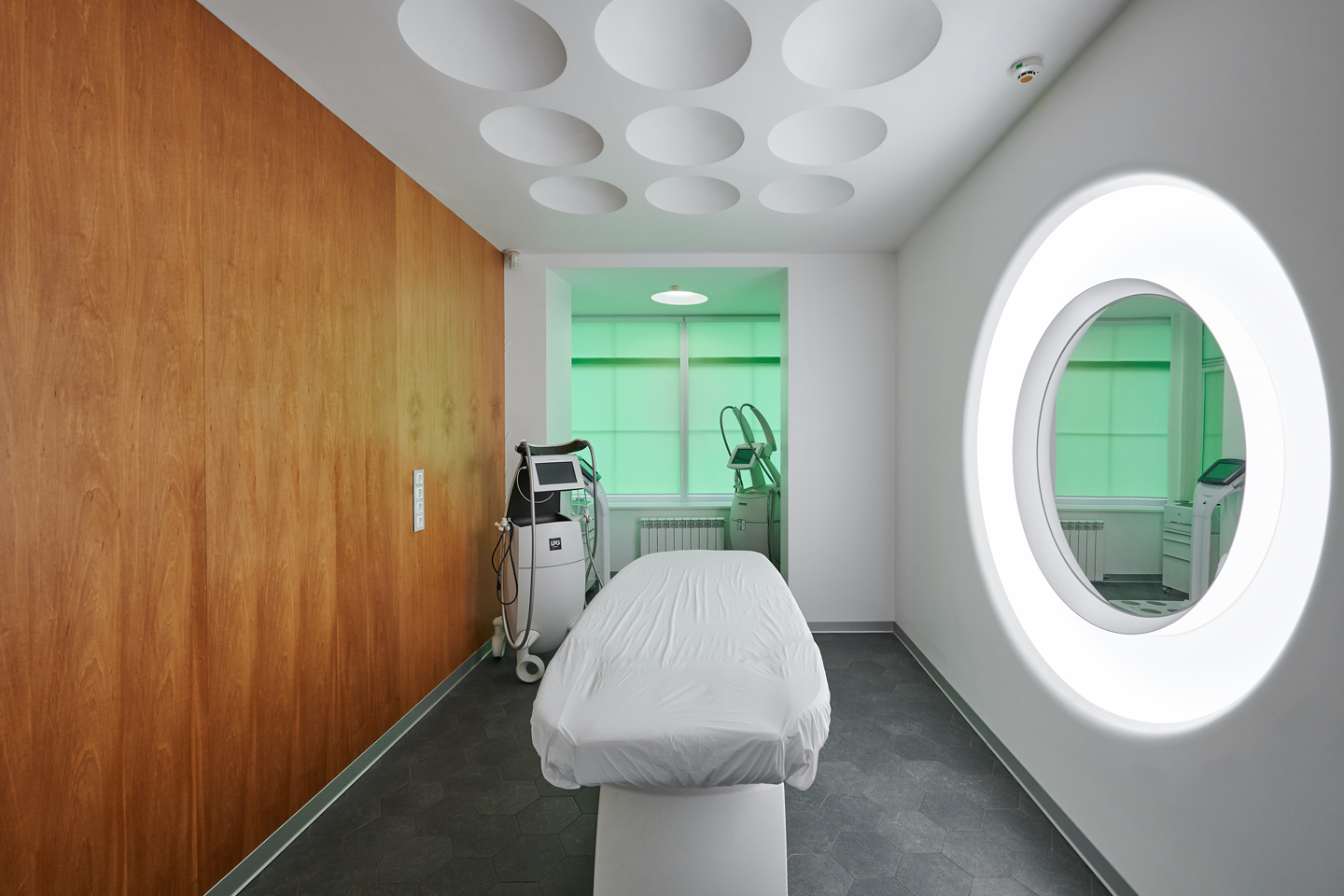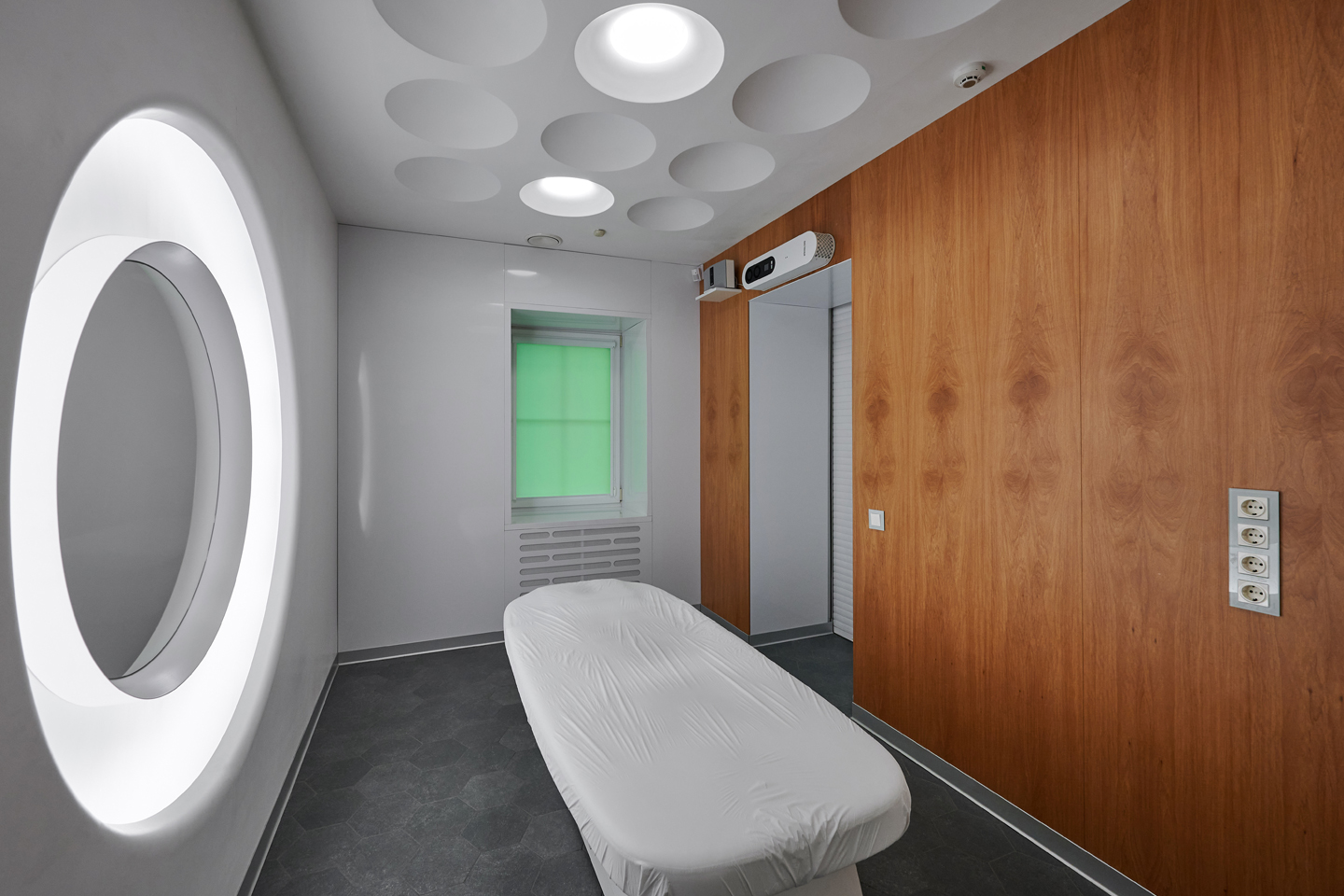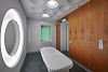 Основной идеей декора массажного кабинета стало сочетание элементов выбранного для оформления всего пространства футуристического стиля и необходимость подчеркнуть интимность и камерность данного пространства. С этой задачей отлично справились стеновые панели во всю стену в пол в натуральном шпоне анегри эффектного глубокого оттенка с интересной текстурой.